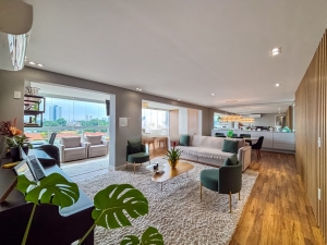 A área social é um dos grandes destaques, com sala integrada ao living, criando um espaço amplo, iluminado e convidativo. O imóvel está totalmente mobiliado, com móveis planejados de excelente qualidade, além de um living belíssimo que harmoniza com o estilo contemporâneo da unidade.